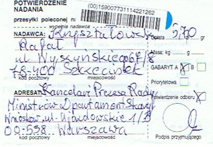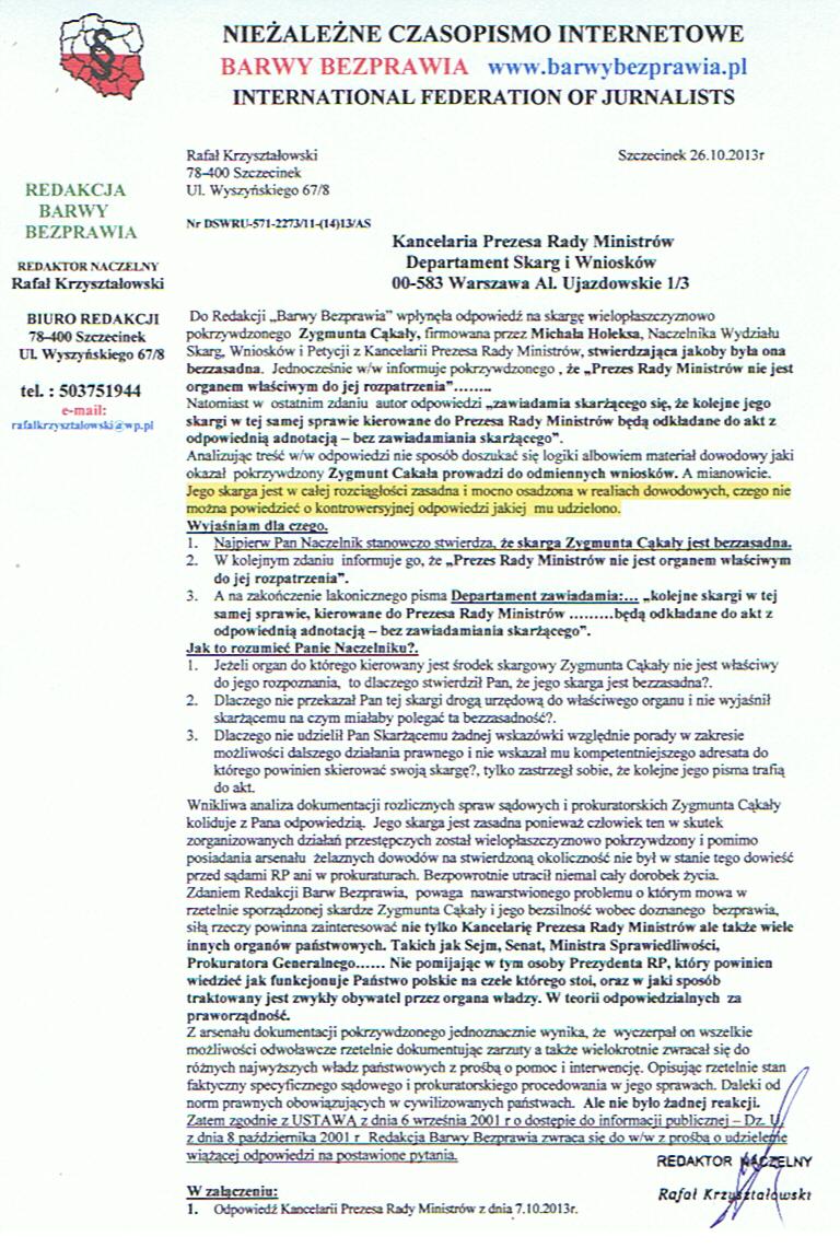 Jak wynika z poniższej odpowiedzi udzielonej Panu Zygmuntowi Cąkale przez Michała Holeksa, Naczelnika Wydziału Skarg, Wniosków i Petycji z Kancelarii Prezesa Rady Ministrów, jest to całkowicie impotentny organ. Który z powodu wybitnej niekompetencji zatrudnionych w nim urzędników nie spełnia oczekiwań społeczeństwa. Po wyczerpaniu wszelkich możliwości skargowych, ofiara urzędniczego bezprawia, tkwiąc w desperackiej naiwności zwraca się o pomoc i interwencję do Kancelarii Prezesa Rady Ministrów, rzetelnie opisując stan faktyczny. Ten 62 letni rolnik ze Świeszyna k/Koszalina ciągle wierzył, że za sprawą interwencji najwyższych władz państwowych zostanie przywrócona jemu ochrona prawna i odzyska wszystko czego pod pozorami prawa został pozbawiony przez urzędniczą sitwę. W skutek zorganizowanych działań przestępczych ten zamożny i dobrze prosperujący rolnik w chwili obecnej stał się bankrutem życiowym. Większa część wielohektarowego gospodarstwa została mu już zabrana za sztucznie wygenerowane długi. Natomiast pozostała czeka na zlicytowanie. Grozi mu widmo głodu i bezdomność.