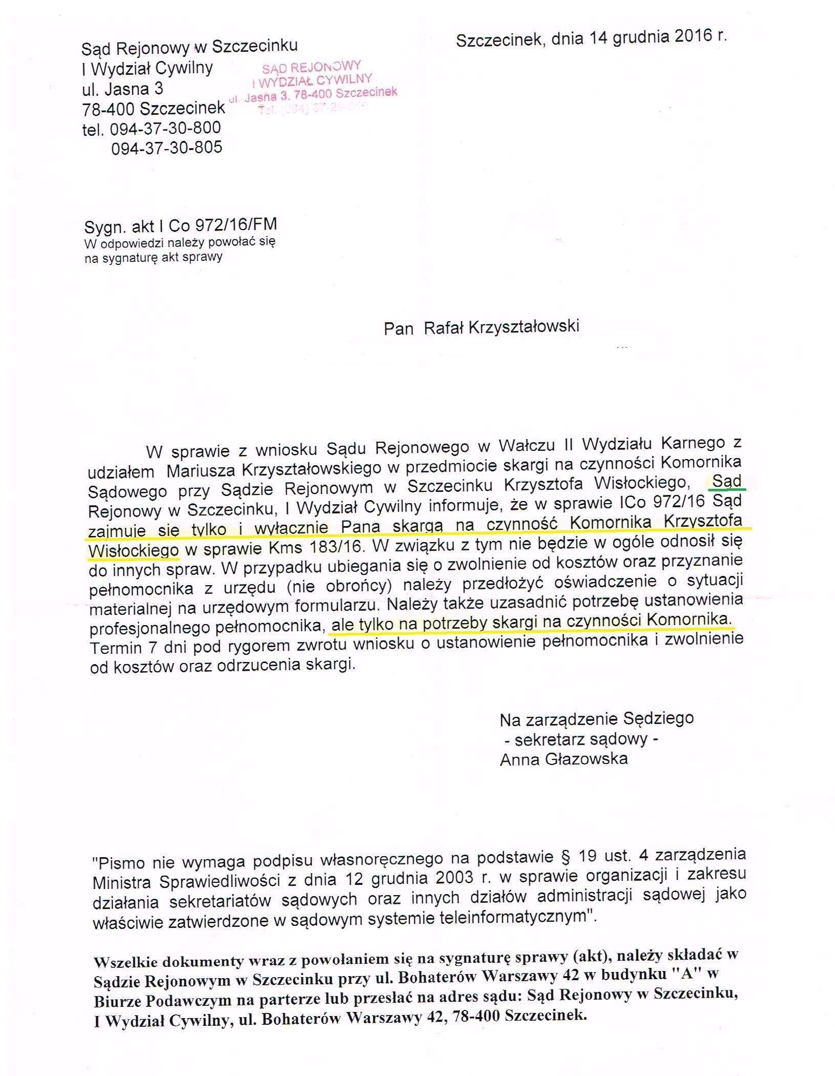 Dyspozycyjny komornik sądowy Krzysztof Wisłocki, idąc „po trupach do celu”, chce wydębić dla siebie od Mariusza Krzyształowskiego zwrot wydatków komorniczych związanych z przedwczesną egzekucją. Wszczętą zanim chłopak wyczerpał przysługujące mu środki skargowe. A przy tym nie ma znaczenia dla komornika, że po rozpoznaniu zażalenia przez „Sąd” Okręgowy w Koszalinie, „dłużnik” bez jego pośrednictwa sam niezwłocznie wpłacił całą bezpodstawnie nałożoną na niego grzywnę do kasy wałeckiego skorumpowanego sądu, który w następstwie dokonanej wpłaty był zmuszony egzekucję wycofać. Ze względu na niemożność wyegzekwowania elementarnej sprawiedliwości od przestępców pozawijanych w togi, reprezentujących konstytucyjne organy Państwa, jakimi są Sądy Rzeczypospolitej Polskiej okręgu Koszalina, musieliśmy złożyć wniosek do „Sądu” Rejonowego w Szczecinku o wyznaczenie bezbronnemu Mariuszowi Krzyształowskiemu profesjonalnego obrońcy z urzędu do pomocy w sprawie „komorniczych wydatków”, a także do sporządzenia fachowego zawiadomienia o możliwości popełnienia przestępstwa na jego szkodę przez SSR Emilię Błażewicz. Usankcjonowanego przez popleczników z grona towarzysko – zawodowego. Chroniących ją przed odpowiedzialnością dyscyplinarną i karną pomimo iż z premedytacją dopuściła się perfidnego przestępstwa. Pociągającego za sobą cierpienie psychiczne u Ukaranego oraz znaczące pogorszenie sytuacji bytowej. Ale szczecinecki skorumpowany sąd tradycyjnie postanowił zignorować fakty i swoją powinność. W swoim piśmie z dnia 14.12.2016r, będącym odpowiedzią na obszernie uzasadniony wniosek o przydzielenie Mariuszowi Krzyształowskiemu wskazanego imiennie obrońcy z urzędu „sędzia” oznajmił, że „nie będzie odnosił się do innych spraw”. Czyli nie zweryfikuje twardych dowodów bezprawności i bezpodstawności nałożonej na Mariusza grzywny, a także nie zainicjuje postępowania dyscyplinarnego wobec SSR Emilii Błażewicz. Jednocześnie zastrzegł, że ewentualne przydzielenie Skarżącemu adwokata z urzędu musi być dobrze umotywowane a udzielona mu pomoc prawna nie będzie mogła wykraczać poza orbitę skargi na czynności Komornika. Zostawiamy to bez komentarza.