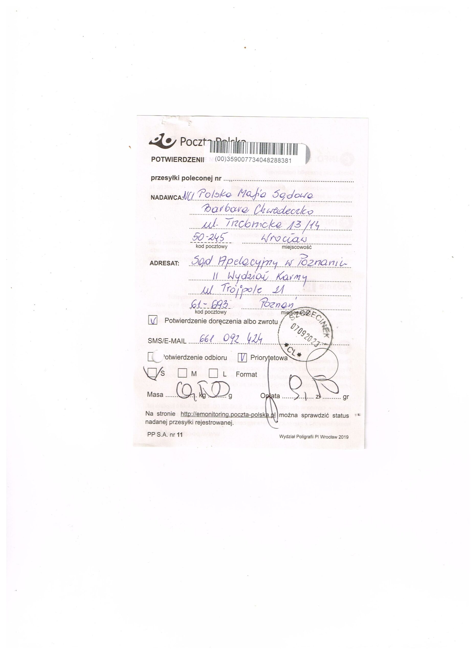 - oświadczenia z dnia 8 września 2023 r. Barbary Chwedeczko wraz z załącznikami na okoliczność przebywania przez Barbarę Chwedeczko wraz ze skarżącym w dniu 31 maja 2023 r., w budynku Sądu Okręgowego w Poznaniu, reakcji fizjologicznych organizmu skarżącego wynikających ze stresu związanego z koniecznością przebywania w sądach i podejmowania obrony własnych praw przez skarżącego i tym samym braku zamiaru ubliżenia sądowi na posiedzeniu w dniu 18 lipca 2023 r. słowami „na widok sądu dostaje torsji”,