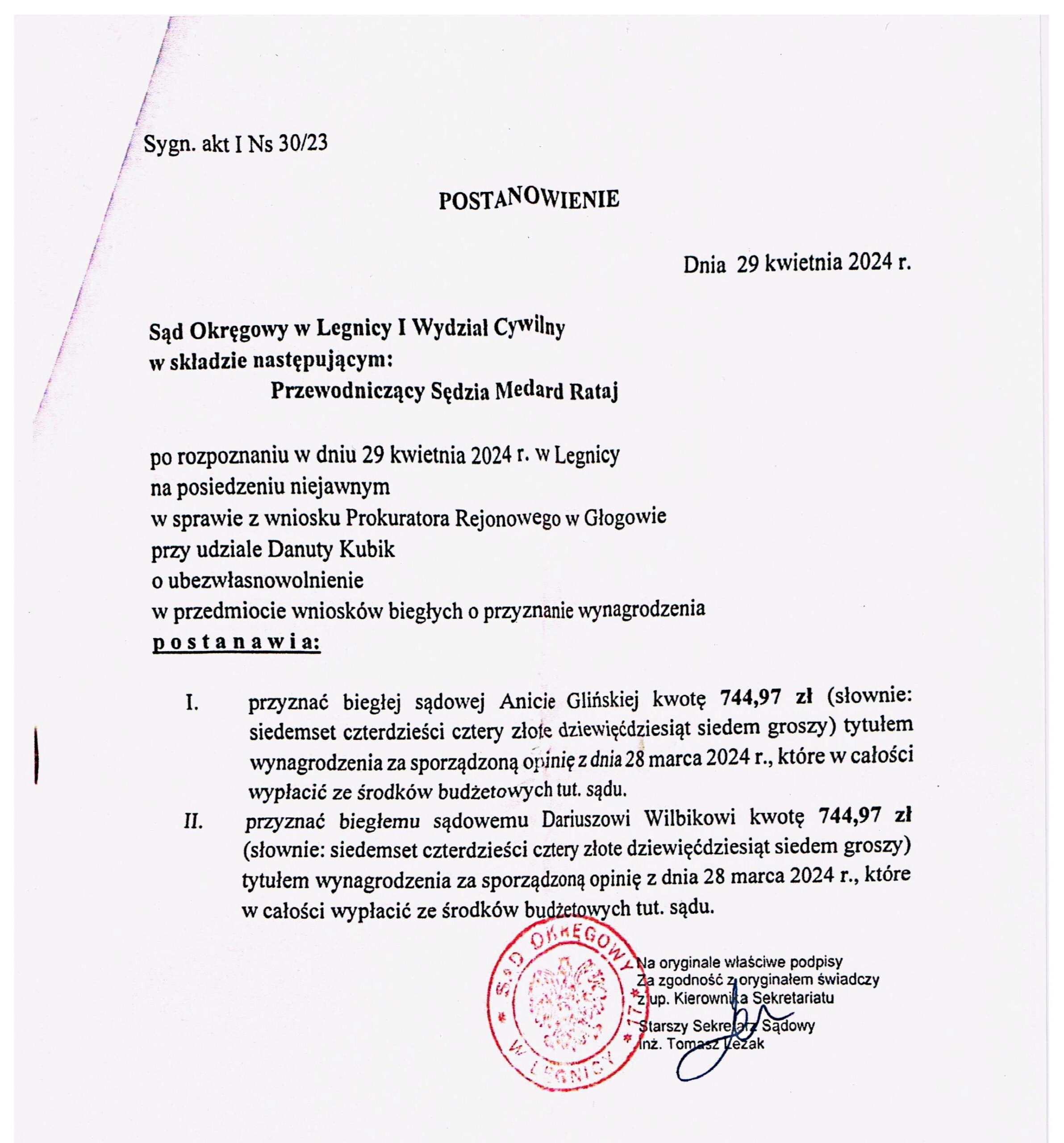 To nieszczęsne badanie sędziowsko psychiatryczno psychologiczne miało jeszcze kilka innych „smaczków”. A mianowicie. W trakcie kiedy Danuta Kubik skarżyła się biegłym, że sądy notorycznie odmawiają jej prawa do adwokata z urzędu i uwolnień od kosztów sądowych, starał się ją wybić z toku rozumowania i zmienić temat pod hasłem, że to nie ma żadnego znaczenia przy prowadzonym badaniu. Drwiąc sobie z przytaczanych przez nią faktów wyniośle oznajmił, że w tej sprawie ma pani adwokata. No ma. Tylko po co ?. W tej sprawie akurat nie był jej potrzebny. Chodzi o adwokata Macieja Kosowskiego, który zwodził perfidnie Danutę kubik tanimi frazesami uporczywie unikając kontaktu służbowego z nią. Na domiar złego ten „wspaniały” mecenas nie raczył wziąć udziału w tym zaimprowizowanym diagnostycznym przedstawieniu. Może czasu nie miał dla diagnozowanej Danuty Kubik ?. Nie chciał przeszkadzać w zainicjowanym linczu psychiatrycznym, który siłą rzeczy nie powiódł się. Tak czy inaczej zapewne nadzwyczajna kasta zasądziła dla niego godziwe wynagrodzenie za wybitną niekompetencję. Uchodzącą w tym patologicznym środowisku za wielką cnotę. Brawo Panie mecenasie. W odniesieniu do biegłych należy stwierdzić, że w niecałe 10 minut „intensywnego badania”, polegającego na zadaniu Danucie Kubik kilku prozaicznych pytań potrafili określić jej stan zdrowia psychicznego. Wykluczający potrzebę „uszczęśliwienia jej ubezwłasnowolnieniem” z inicjatywy mocno uprzedzonych do niej, Mai Pluskota z Sądu Rejonowego w Głogowie i prokurator Małgorzaty Jaros. Po przeanalizowaniu przebiegu tej groteskowej czynności diagnostycznej nasuwa się wiele refleksji. Między innymi zastanawia fakt, że w badaniu psychiatrycznym czynny udział brał sędzia. Jaką miał wyznaczoną rolę ?. Dlaczego się nie parafował tej opinii ?. Może egzaminował swoich ekspertów od przypadłości psychicznych ?. A może pilnował z góry ustalonego „porządku prawnego”?. Jeśli nie, to pewnie chciał dać solidnie zarobić nedykom. Wskazuje na to tempo badań. Śpieszyli się do następnych „pacjentów”. I wcale to nie dziwi że było im śpieszno skoro za każdego diagnozowanego „podsądnego” otrzymują na łebka po 750 zł. Za 10 minutowe rzucanie okiem i zadania kilka pytań badanemu. Ciekawe ile takich zleceń sądowych zdążyli obskoczyć tego dnia ?. Zakładając, że standardowe badania sądowe w ich wykonaniu trwają około 10 minut to spróbujmy sobie wyliczyć ich dniówkę. Jeżeli za 10 minut rzucania okiem na pacjenta należy się 744,97, to za godzinę takiego diagnozowania wychodzi 4469,82zł. A jak to się ma do całego dnia ?. Przecież to żyła złota. Eldorado. W związku z tym nasuwa się pytanie czy zlecanie nieuzasadnionych badań psychiatrycznych ma jakiś inny ukryty sens ?. Może chodzi o to żeby po prostu, tak po koleżeńsku dać zarobić dyspozycyjnym biegłym sądowym ze swojego kręgu towarzyskiego ?. Bo jak to możliwe żeby za 10 minut postania na cudzej podłodze dostać takie wynagrodzenie. Może w końcu ktoś to rzeczowo wyjaśni. Bo ręce opadają jak pod pozorami prawa bezczelnie drenuje się kieszeń podatnika. Traktując Skarb Państwa jak prywatny worek pieniędzy nadzwyczajnej kasty. Czas z tym skończyć. Za nieuzasadnione badania psychiatryczne powinni płacić ci, którzy takie badania zlecają i wypłacać odszkodowania osobom zmuszonym się do ich poddania, pod groźbą doporowadzenia przez polcję. Tak, sędzia Retard Rataj groził policją Danucie Kubik. Wytknęła mu to podczas badania. Tak im się paliło, że chcieli te kuriozalne badania przeprowadzić nawet na ulicy czy w klatce schodowej. Taka była ich powaga. Istny cyrk w cyrku.