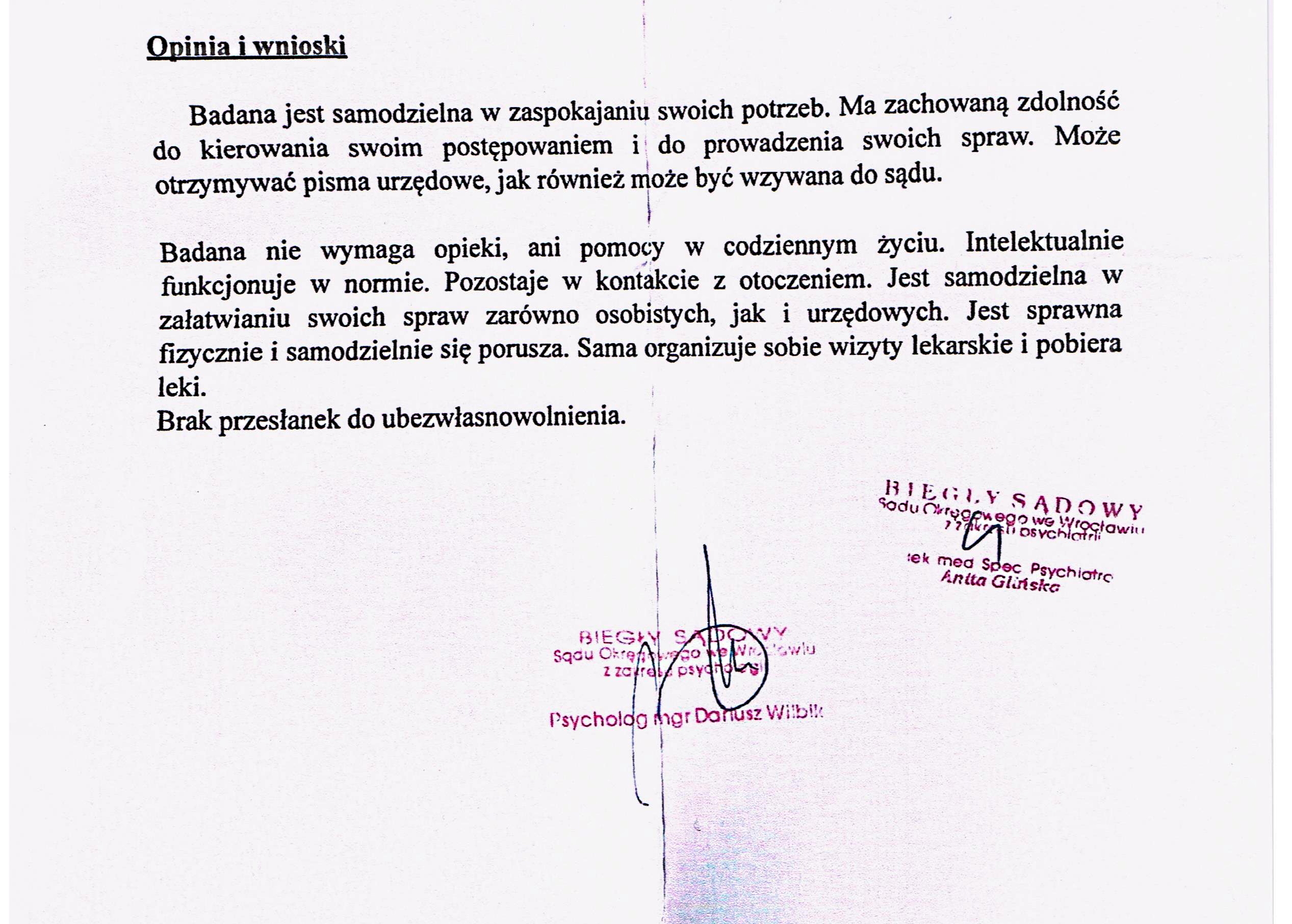 Bezpodstawność wszczęcia tej haniebnej procedury potwierdza także opinia sądowo psychiatryczna z dnia 28 marca 2024r. Firmowana przez psychiatrę Anitę Glińską i psychologa Dariusza Wilbikow.