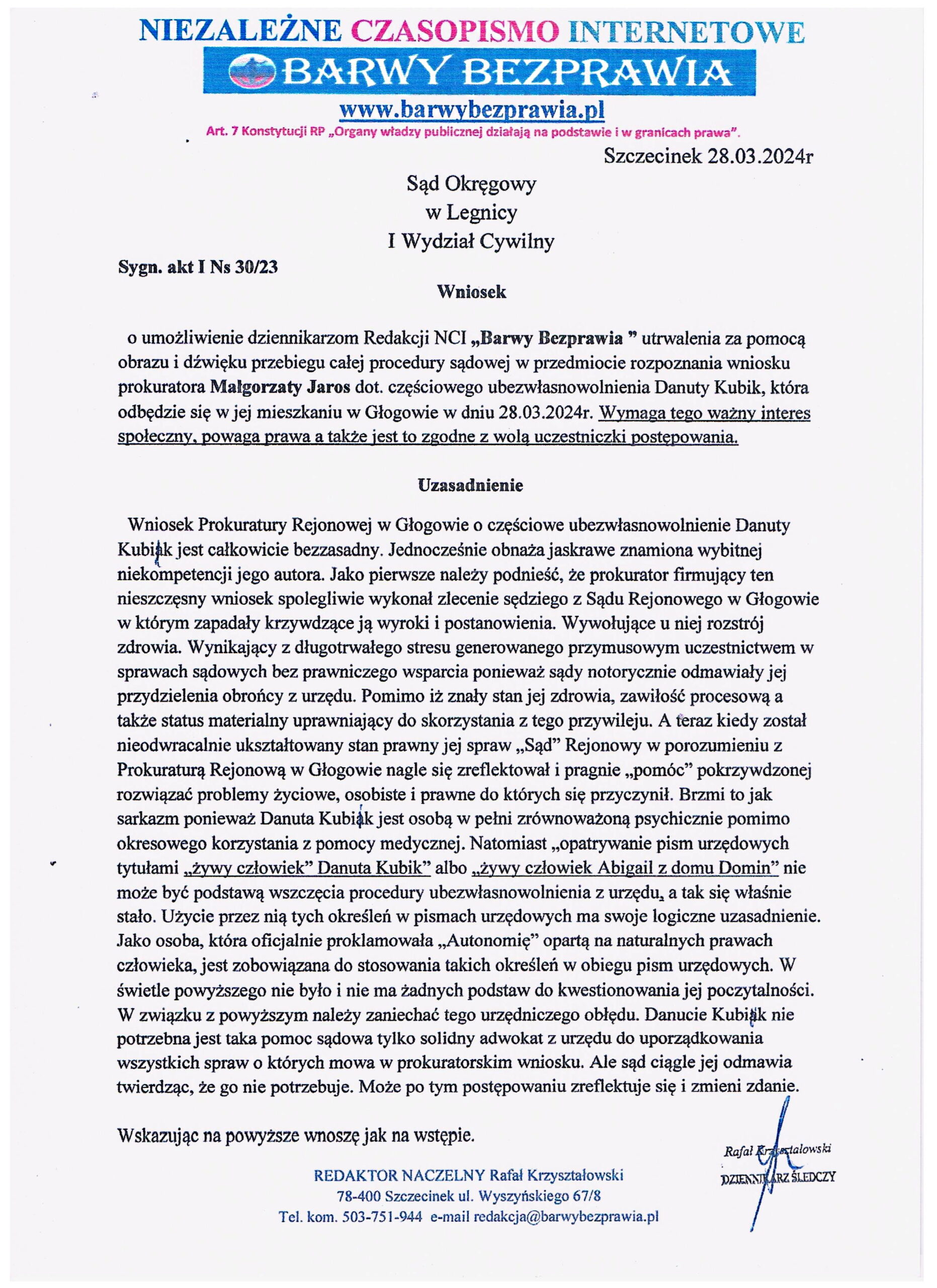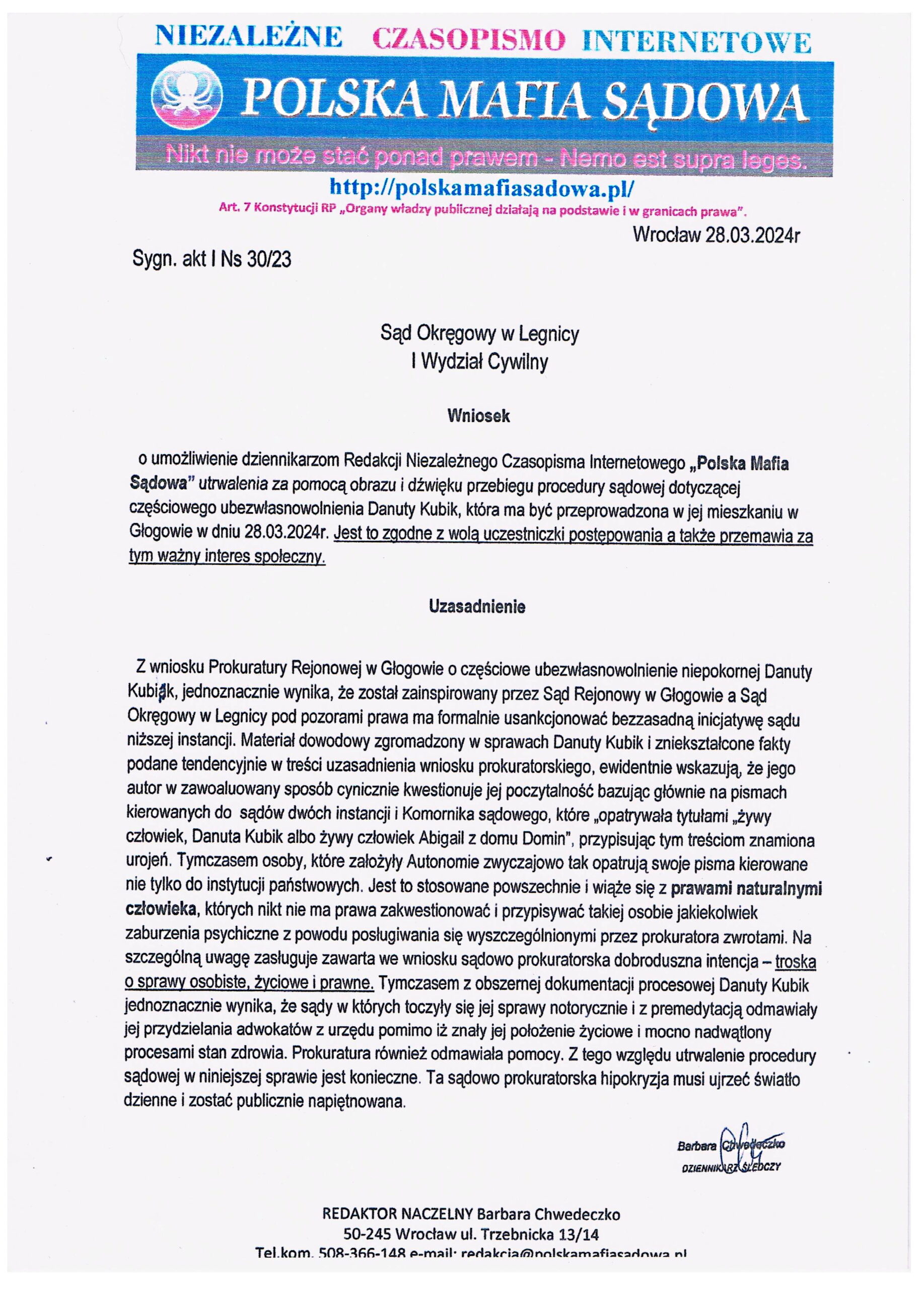Analizując tok tego dziwacznego badania psychiatrycznego, należy stwierdzić, że jego reżyserem jest niewątpliwie sędzia Medard Rataj. Natomiast Anita Glińska – psychiatra i Dariusz Wilbikow – psycholog grają drugie i trzecie skrzypce w tym niezwykłym tercecie. Ograniczyli się do dopytywania Danuty Kubiak o sprawy osobiste z pominięciem istoty jej największych problemów życiowych. Wygenerowanych przez MIASTO, sądy i prokuraturę. Wywołujących u niej poważne problemy zdrowotne do których dosadnie nawiązywała podczas „badania”. Także pokazała biegłym obszerną dokumentację swoich skomplikowanych spraw sądowych z którymi sobie nie radzi z powodu nasilającej się depresji. Wywołanej wielopłaszczyznowym pokrzywdzeniem przez MIASTO, które pozbawiło ją dwóch garaży. Wywiozło ich zawartość i obciążyło kosztami przechowywania w kwocie około 10.000 zł. A Komornik Sądowy dobijał ją psychicznie dobierając się do jej niewielkiej emerytury. I będzie tak długo z niej doił aż wydoi całą kwotę. Nie wykluczone też, że za jakiś czas „powodowie” wystawią jej kolejny rachunek za przechowywanie rzeczy, których de facto nie miała gdzie zdeponować po odebraniu garaży. Do tego wszystkiego Pokrzywdzona nawiązała przy badaniu ale nie zainteresowało to ani sędziego ani biegłych. Nie obchodziło ich też, że sądy znając jej udokumentowane ciężkie położenie życiowe, zdrowotne i materialne odmawiały uporczywie przyznania do pomocy w sprawach adwokata z urzędu oraz zwolnienia od kosztów sądowych, pomimo spełnienia wszystkich przesłanek uprawniających do skorzystania z tego dobrodziejstwa. W wydanych postanowieniach cynicznie stwierdzają, że adwokat jest jej niepotrzebny bo sobie dobrze radzi na płaszczyźnie prawa. Stać ją także na opłaty sądowego haraczu w postaci kosztów sądowych spraw, w których wbrew swojej woli musi uczestniczyć jako strona procesowa – Pokrzywdzona. Ten sędziowski szyderczy sarkazm ma swoje pełne odzwierciedlenie w zainicjowaniu Danucie Kubik postępowania o ubezwłasnowolnienie. Pod pozorami „zatroszczenia się o jej dobro”. W postaci ubezwłasnowolnienia. Pod pretekstem, że sobie nie radzi w życiu i na płaszczyźnie prawa zostaje wdrożona procedura ubezwłasnowolnienia chociaż nie było ku temu racjonalnych powodów do czego dosadnie nawiązywały treści wniosków dziennikarzy NCI Polska Mafia Sądowa i NCI Barwy Bezprawia. Przybyłych do Głogowa przyjrzeć się temu urzędniczemu obłędowi.