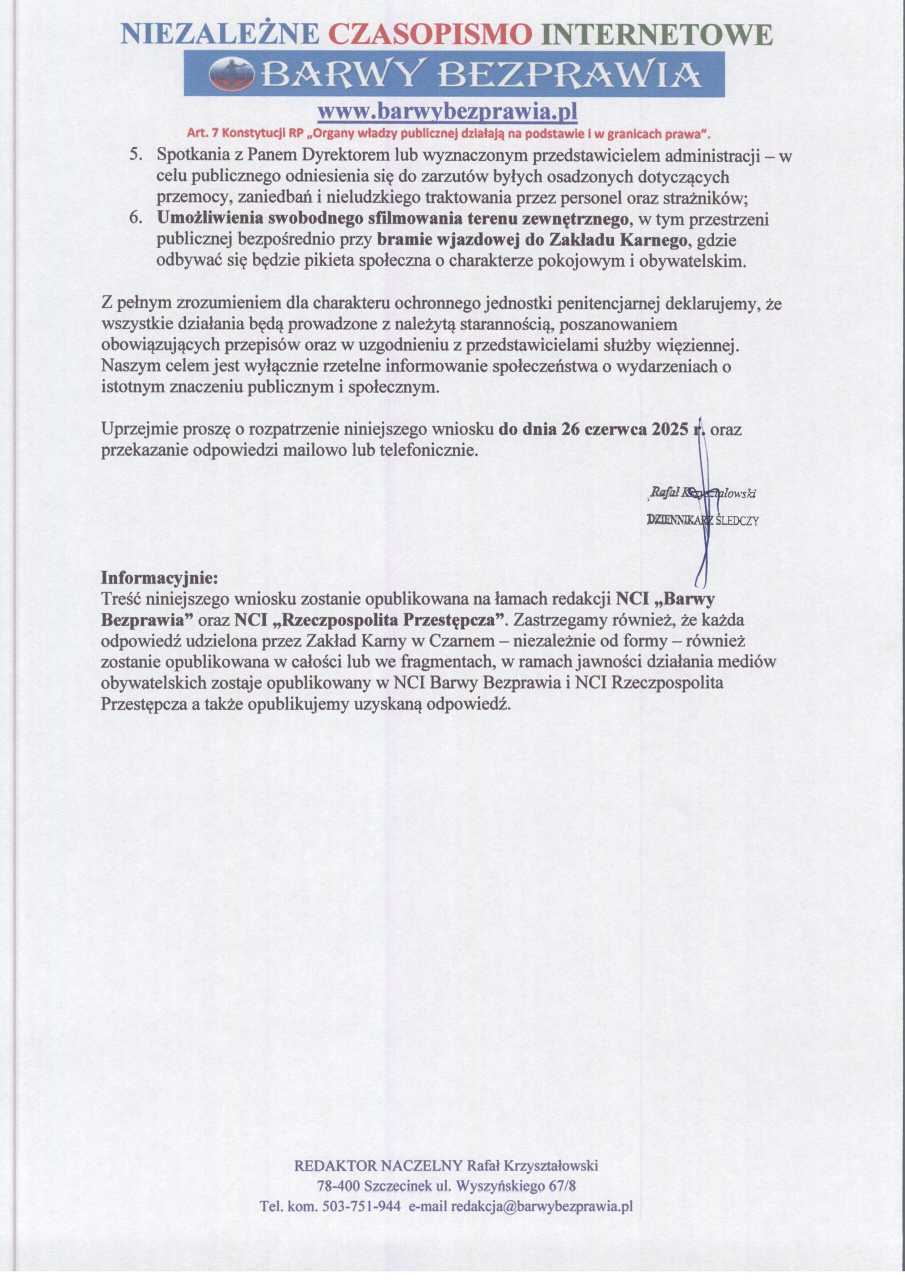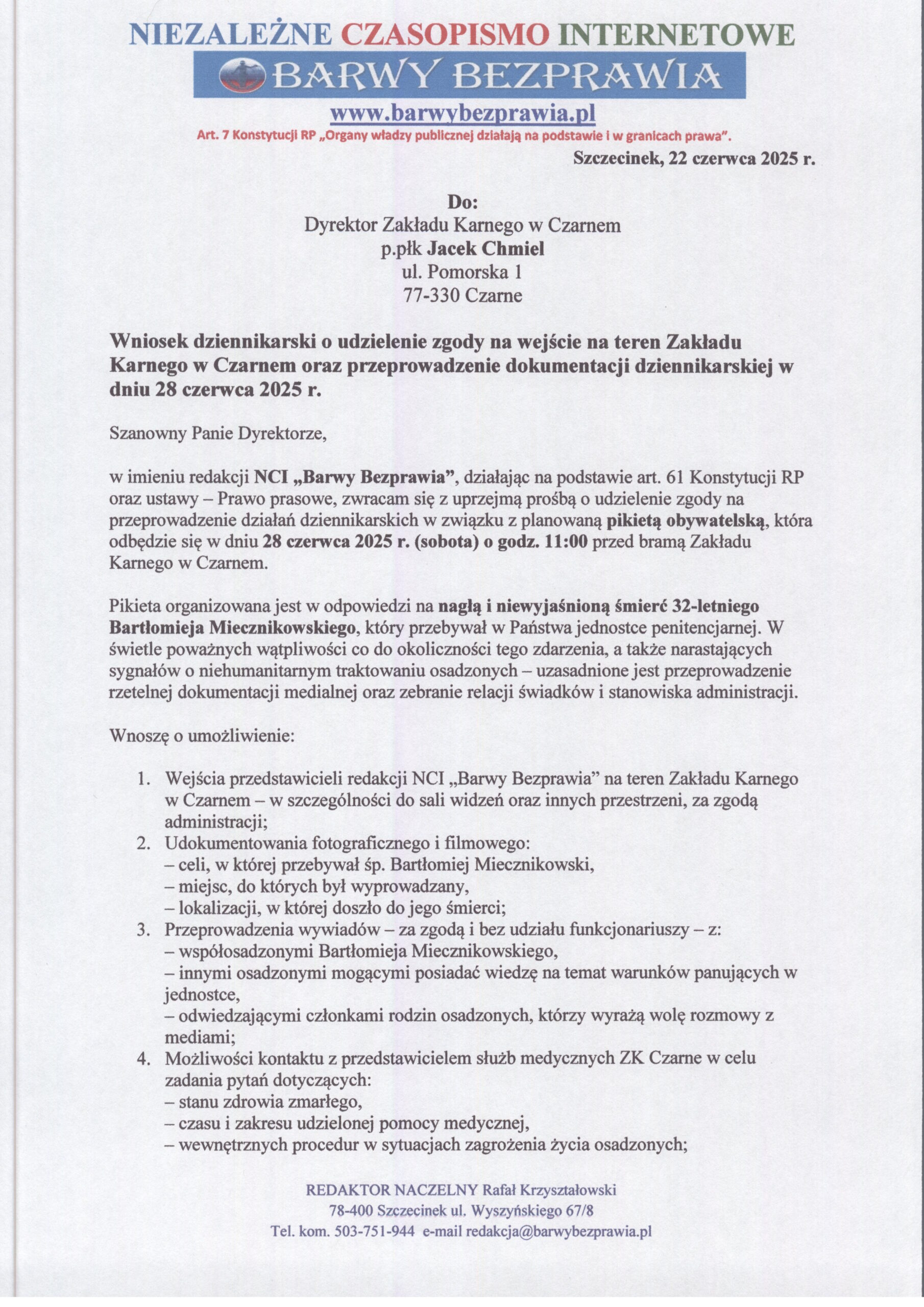 Śmierć 32-letniego Bartłomieja Miecznikowskiego w Zakładzie Karnym w Czarnem to nie jest „zwykły incydent” – to tragedia, która budzi wątpliwości, lęk i gniew. I choć minęło już kilka dni, wciąż nie otrzymaliśmy ani jasnych wyjaśnień, ani ludzkiej reakcji ze strony kierownictwa jednostki penitencjarnej. W tej sytuacji redakcja NCI „Barwy Bezprawia” – działając w interesie publicznym i w imię obywatelskiego obowiązku – skierowała oficjalny wniosek do Dyrektora ZK w Czarnem, p.płk. Jacka Chmiela, z żądaniem dopuszczenia dziennikarzy do dokumentowania prawdy. Żądamy nie tylko dostępu, ale też konfrontacji z rodziną, z pytaniami i ze społeczeństwem.
