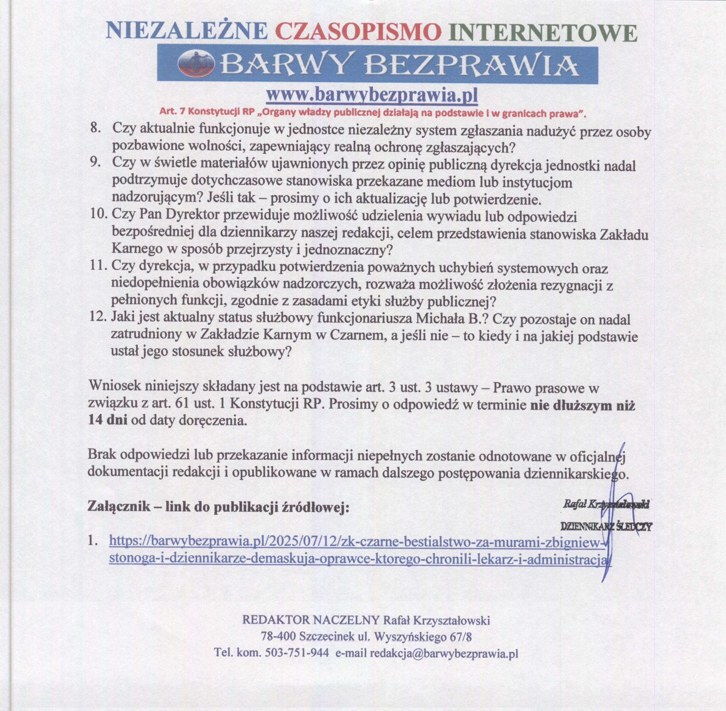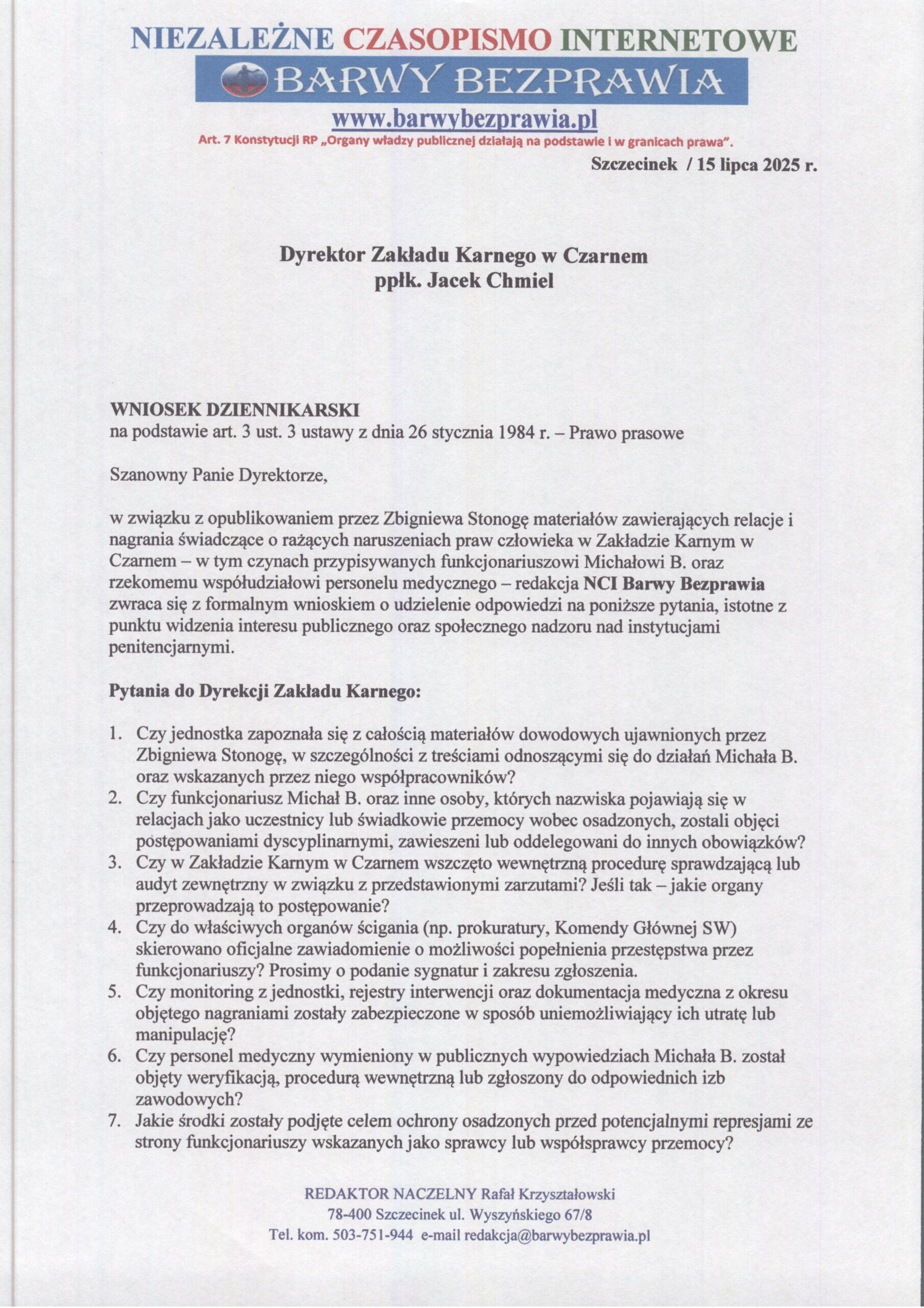 Ujawnione publicznie przez Zbigniewa Stonogę materiały, dokumentujące brutalne i sadystyczne praktyki wobec osadzonych w Zakładzie Karnym w Czarnem, nie mogą zostać zamiecione pod dywan. Głównym bohaterem nagrań jest funkcjonariusz Michał B., który – jak sam twierdzi – działał przy cichej akceptacji przełożonych i personelu medycznego. Redakcja NCI Barwy Bezprawia natychmiast skierowała do dyrektora jednostki formalny wniosek dziennikarski, zawierający dwanaście jednoznacznych pytań. Każde z nich dotyczy realnej odpowiedzialności, ukrywanej dotąd przemocy oraz możliwego współudziału lekarzy w tuszowaniu śladów tortur. Pytania te publikujemy w całości, bez skrótów, bez cenzury – bo prawda nie potrzebuje komentarza.